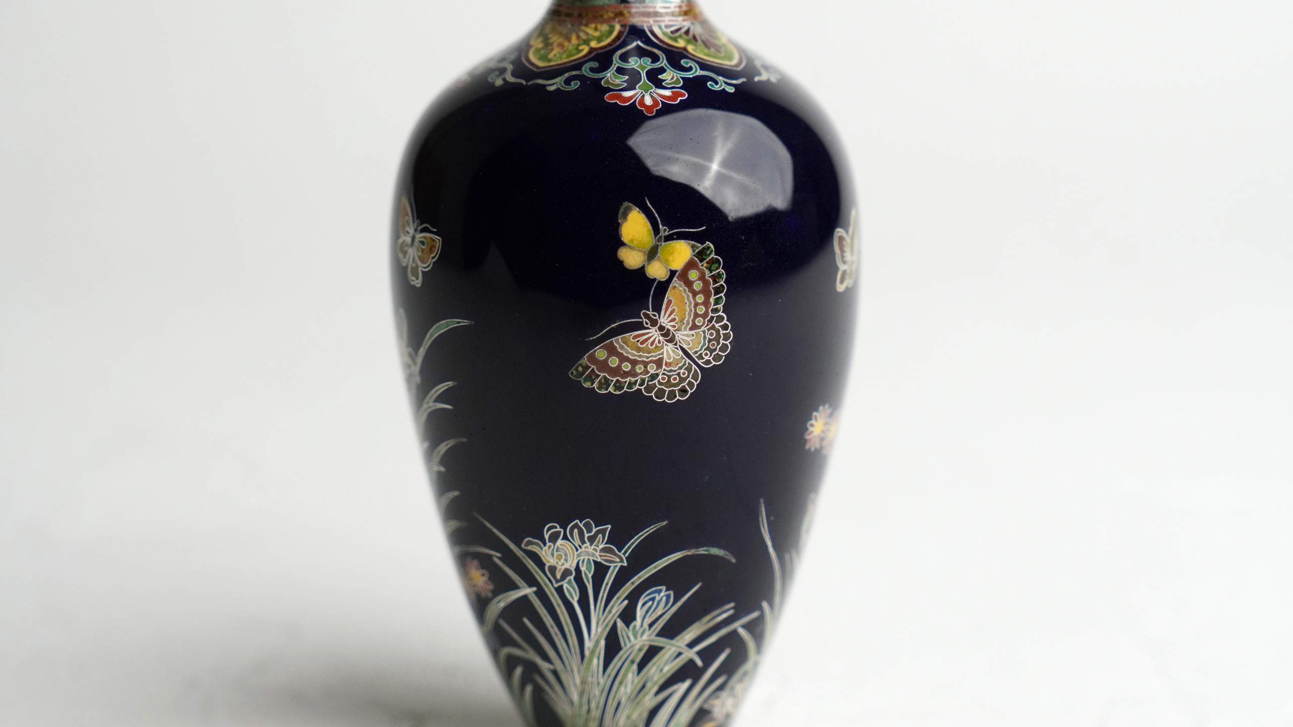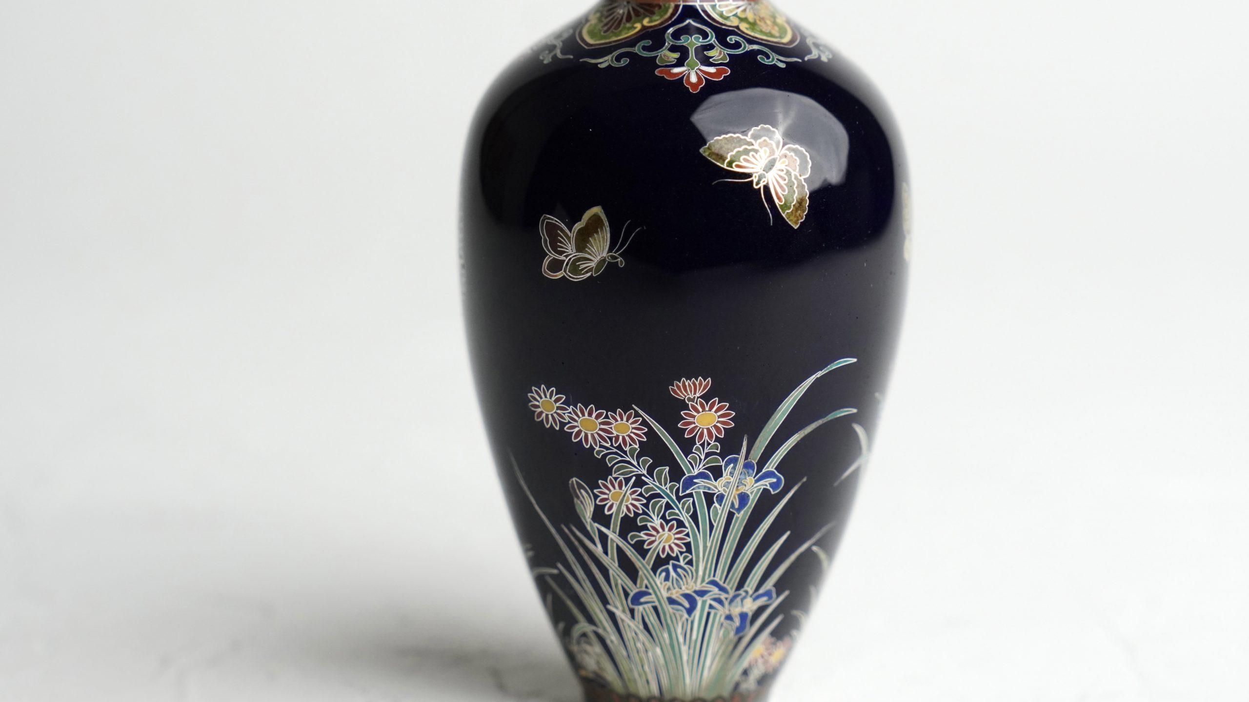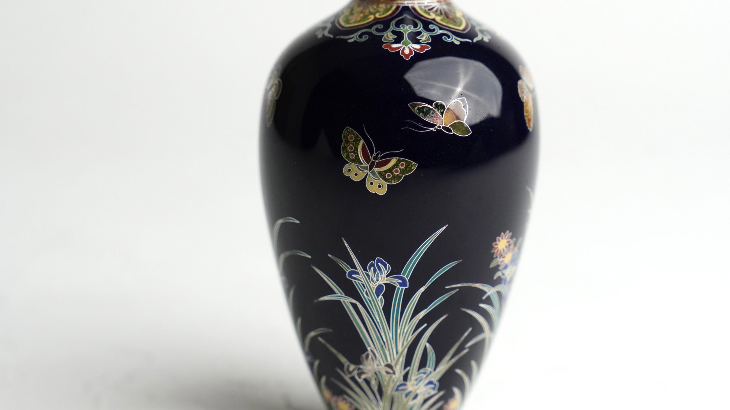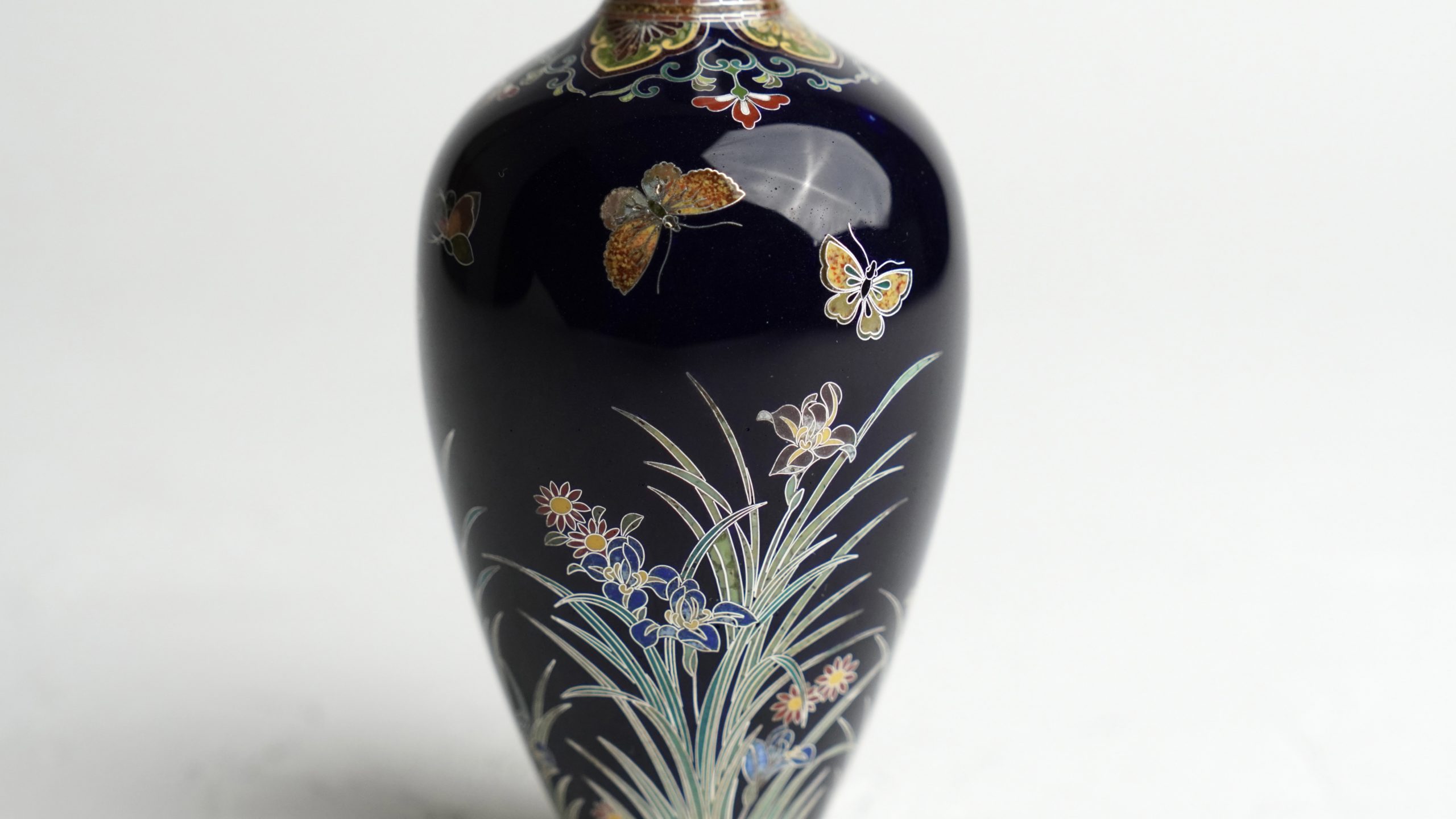 深みのある紺色の背景に、菖蒲と、蝶が彩り豊かに表現されております。その構図は静と動の調和を感じさせ、見る者の心を惹きつけます。さらに鶴首部分には精緻な幾何学模様が施されており、細部に至るまで一切の妥協を許さぬ並河の卓越した技術と美意識が窺えます。